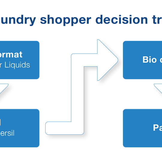 The laundry shopper ‘decision tree’, which maps how shoppers make their decision about what to buy, shows that product format is first in the decision-making process. Next up is brand, followed by whether the product should be bio or non-bio, and then finally pack size. With product format at number one in the list, it is clearly another important dynamic to take into consideration.